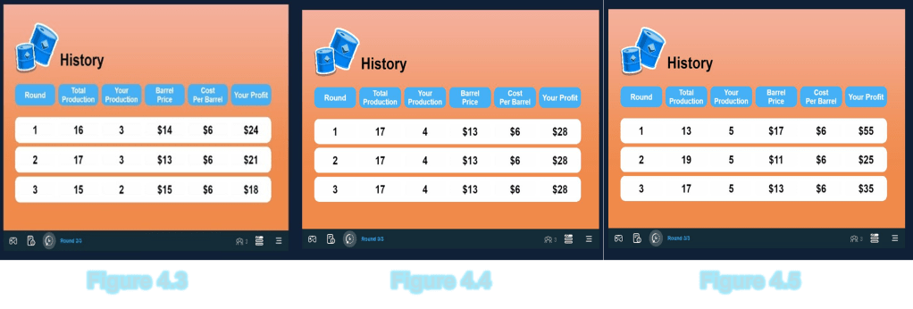 In the simulation game Cournot, I was playing as a firm in the Oil Market, there were always 3 firms, with a maximum production of 10 barrels per firm, and a price per barrel. Our profit depended on the change in market price per barrel, which changed based on the total market production of barrels. Barrel cost never changed at $6 per barrel. In Attempt One I kept my production at the low end to see how much the other companies would produce once I got a general understanding of where they would be producing. In Attempt Two I increased my production by 1 from 3 to 4 barrels. Shown by Figures 4.3 and 4.4. This helped me to see that I could potentially double my profit at a lower barrel price just by a few dollars when total production is higher compared to lower. When I continued to Attempt Three (Figure 4.5), I realized if the total production is low and the barrel price is high I make double the money when producing 5 barrels than 4 at high total production and low barrel price. This showed me that understanding the market and inferencing my competitors’ production rate, What goes up must come down, and the opposite is true when talking about the movement along the demand curve.