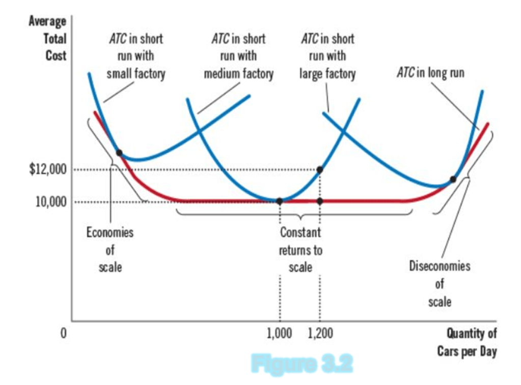 In the Long Run, there are no fixed factors, all variable factors But in the Short Run, there are both fixed and variable factors. In the long run, there are no fixed costs so the costs do not influence production. However, in the short run, there are fixed costs that influence production. For Example, looking at Figure 3.2, we can see that the average total cost is on the Y-axis and the X-axis is the quantity of Cars per day. Each blue curve represents different factory sizes in the short run, starting from the left and moving to the right with Small, then Medium, and lastly Large. The red curve represents the long-run Average total cost vs quantity produced for all factory sizes. To understand graph Figure 3.2, we must first distinguish 3 parts of the graph Economics of scale, constant returns to scale, and diseconomies of scale. Constant returns to scale are when the cost does not change regardless of output, allowing for production changes without penalty. At this stage Market changes do not affect the quantity produced. Diseconomies of scale are shown on the right side of each curve as a cost disadvantage due to increasing cost as production output increases. Economies of scale are on the left side of each curve showing the cost of production is high and production is low but is lowering to an equilibrium state where the cost and quantity of production are economical. The size of the factory changes the production rate because the business can only produce so much in the square footage of the shop floor. Keep in mind, the larger the space the higher the Average Total Cost but more can be produced. On the other hand, a smaller place has a lower Average Total Cost but less produced. We covered several key terms and their factors for production, entry and exit, Marginal cost and revenue, long run, short run, and market equilibrium.